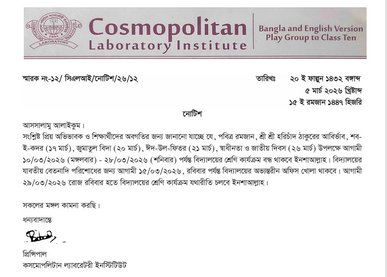 পবিত্র রমজান মাসের ১ম রোজা উপলক্ষে বিদ্যালয় বন্ধ ২০২৬ Wednesday, February 18, 2026