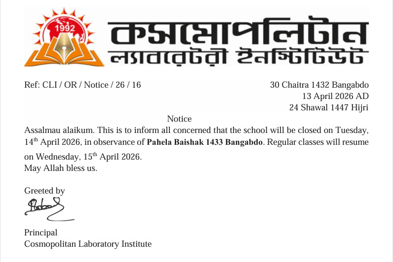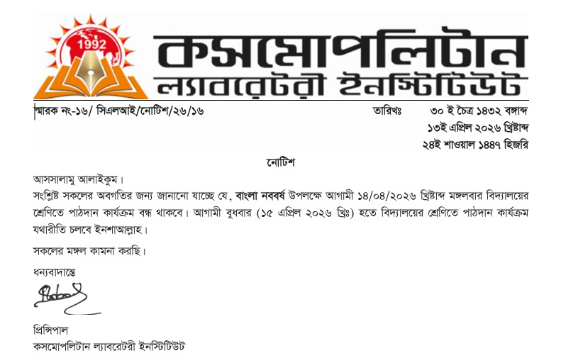 বাংলা নববর্ষ পহেলা বৈশাখ ১৪৩৩ বঙ্গাব্দ উপলক্ষে নোটিশ